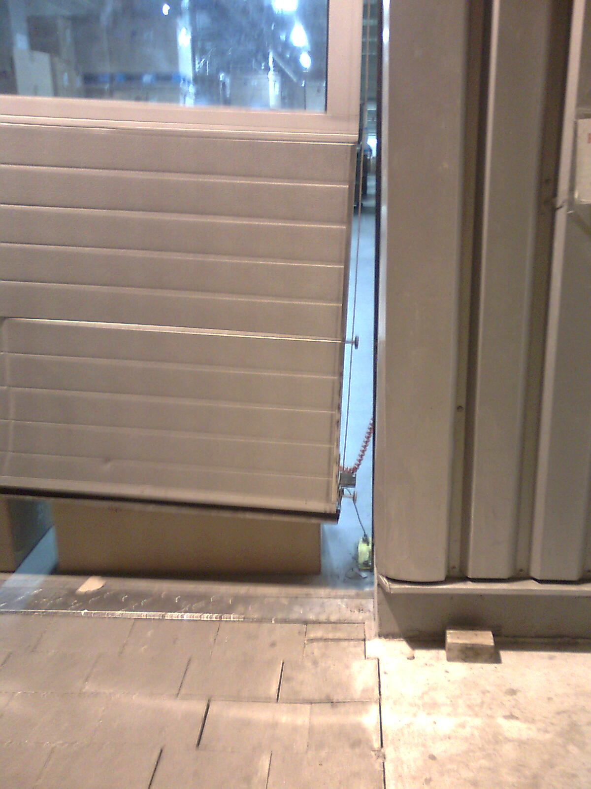 Mňa nepotešilo,že nejaký exot včera tesne pre koncom popoludňajšej zmeny vyvalil bránu do haly,neviem ako sa mu to mohlo podariť,to je záhadou doslova zdemolovať bránu,viď foto,tak sme museli na nočnej improvizovať ako sa dalo,jazdiť vozíkom pomedti stroje a dookola,ale zvládli sme to. dnes,dúfam to už bude v poriadku,poslednú šichtu u tohto zamestnávateľa chcem prežiť v kľude