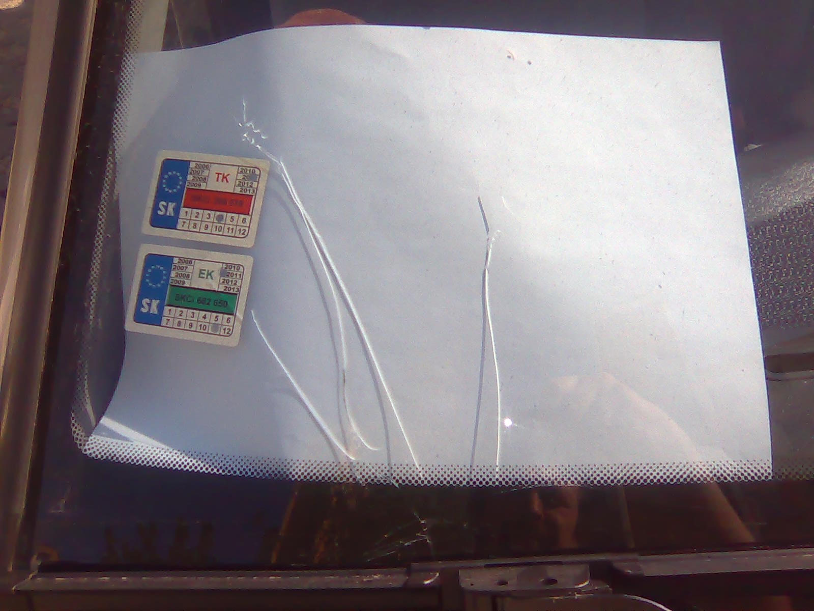 Tu je fotka rozbitého skla. Dnes mi volali z JUMAZ-autosklo. V piatok mi dovezú nové čelné sklo zelené s modrým protislnečným pásom v hornej časti, rámik, a lepidlo. Sklo je 65,00 eur, rámik 10,00 eur a lepidlo 9,00 eur. Spolu 84,00 eur. Dovoz je zdarma. Namontujú mi v servise za 20,00 eur. Teda to bude 104 eur. Obehal som firmy tu v N. Zámkoch zaoberajúce sa výmenou skiel.