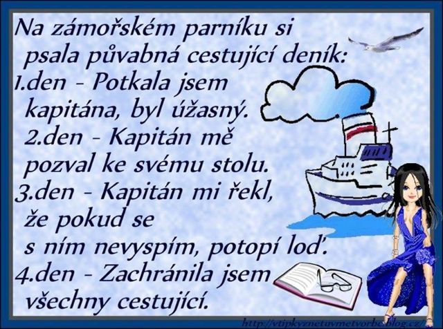 „A kolik vám je, paní Horáčková?” „Padesát.” „Neříkejte - ani na to nevypadáte!” „I vy lichotníku...” „Kdo vám lichotí - vypadáte nejmíň na sedmdesát!”