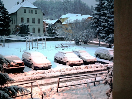 ... takto vypadal dnes ráno pohled z našeho bytového domu , po nočním sněžení