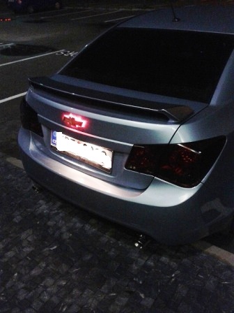 jde o podložku z plexiskla, vyřezanou do tvaru znaku chevrolet, znak je použitý origo z auta, přilepený k podložce..v plexi podložce jsou ledky na prosvícení, do dveří se vrtat nemuselo, dírky už tam jsou pro origo znak. Káblíky připojeny na brzdové světlo - červená led, na obrysovky - bílá. Pokud si to člověk udělá sám tak investice 100kč?