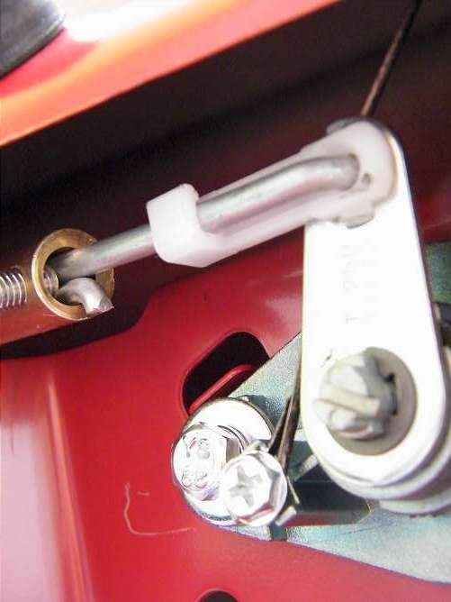 Napojení táhla. Pod tím šroubkem je udělaná pružina z vlásenky do vlasů, aby se motorek vracel do původní polohy.