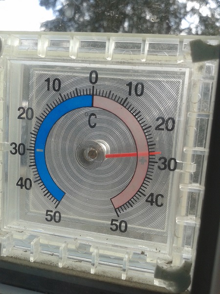 Rudo, teploměr máš zvenčí na jednodílným skle a pod oknem radiátor????