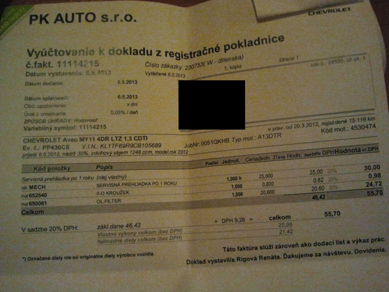 Cena prehliadky 55,70 eur + olej 5w30 dexos2 za 19 eur 5 l (vďaka UPC ma tak lacno vyšiel olej, lebo očividne spravili chybu lebo v balíku bola faktúra na 24,99 za olej :lol: ).