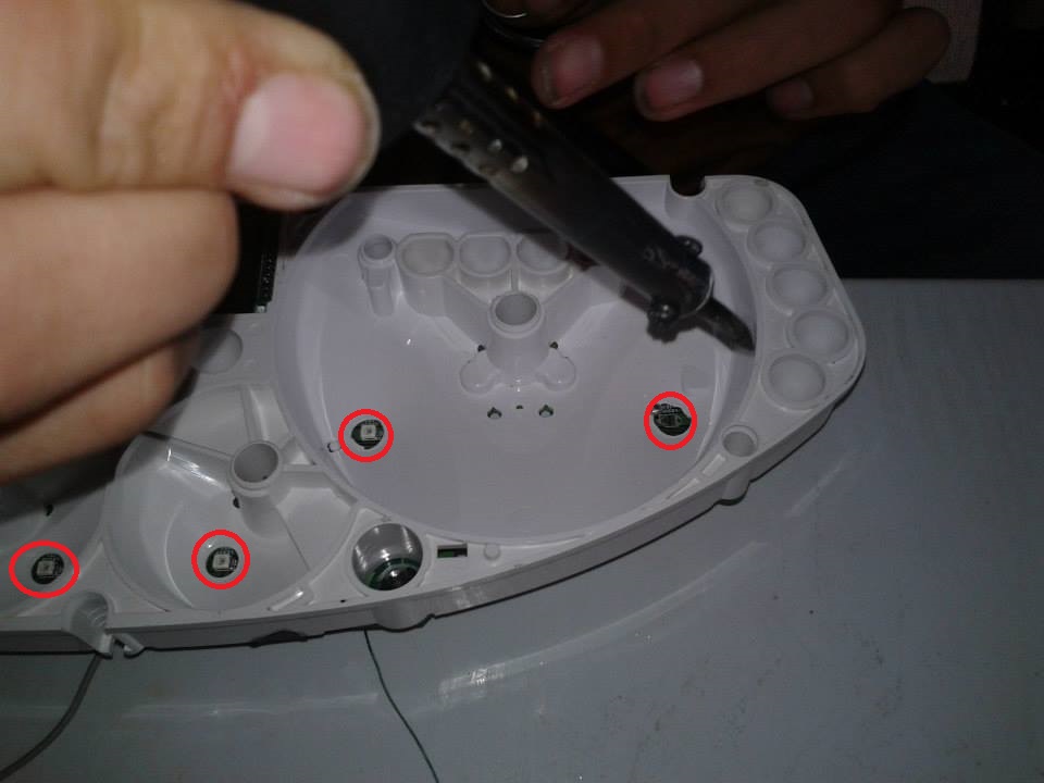 Rozebrání přístrojovky už tu je,takže foto není potřeba Odpájí se původní smd (v červeném kolečku) a napájí se nové (pozor na polaritu,když se pořádně zadíváte na smdčko tak na jedné straně je snížený růžek a ten patří k šipce na základní desce