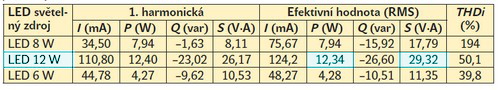 V tab. 1 jsou uvedeny naměřené hodnoty náhodně vybraných tří typů LED zdrojů od jednoho českého výrobce. První typ s uvedeným příkonem 8 W má starší typ elektronického obvodu a další dva typy (12 W, 6 W) mají modernější elektronický obvod. Naměřené hodnoty odběrů LED svítidel (proud I, činný příkon P, jalový příkon Q a zdánlivý příkon S, harmonické zkreslení THDi)