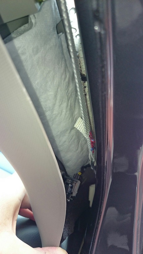 Odtáhnul jsem těsnění abych za sloupek alespoň trošku viděl - nakonec sloupek drží pouze na 1 křapce a 1 jakémsi kontaktu u airbagu. Jde vycvaknout velmi jednoduše.