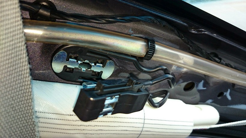 - tapec zůstane viset na horní hraně, zvedáme napřed stranu u zamykacího kolíku, následně uvolníme i druhou stranu, tapec visí na táhlu dveří a nějakém konektoru - při nasazování postupujeme naopak, napřed stranu bez kolíku, pak stranu s kolíkem a domáčknout dolů (je to nejsnažší)