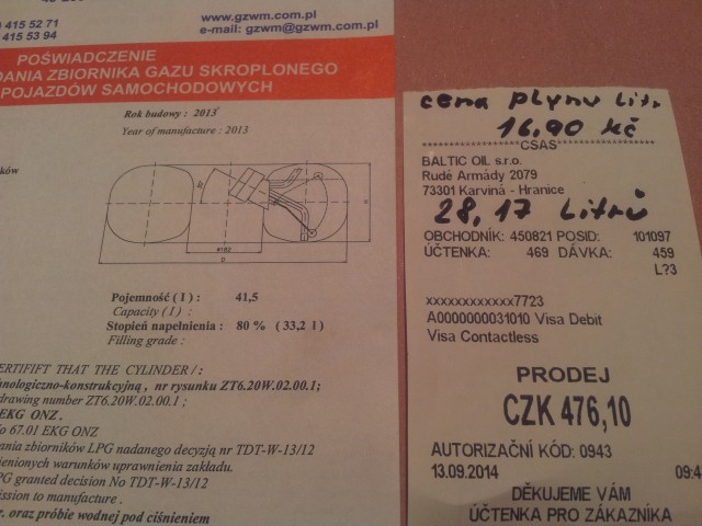 Zdravím ,tak dneska bylo trochu času ,tak jsem nafotil obrázek dokladu o nádrži LPG. tankoval jsem až mi zvukový signál dal vědět ,že je prázdná.Zajel na pumpu a tady je složenka ceny tankování plynu.