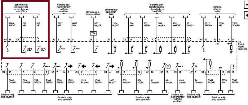Takže resume. V motorovém prostoru je akorát spínání dálkových světel a volný průběh kabelů pro potkávačky a obrysovky. Tam nic nelze udělat. Vše je v kabině, řídící jednotka K9, konektory X4 a X5(jeden signál zadní). Odpojování by muselo být vícepólové, protože spínací relé světel a obrysovek obsahuje přímo kabinová jednotka. Viz. obr. výše.