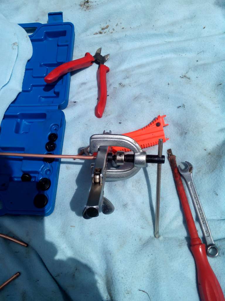 Brzdový trubičky jsem si nakonec vyrobil sám. Kdyby někdo potřeboval, tak je u mně k dispozici lis na zhotovení konců měděných brzdových trubiček. :D