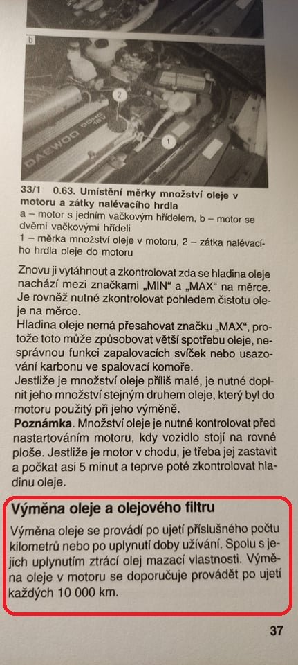 ja si nepamätám, že by malo Daewoo predpísané výmenu oleja každé 2 roky alebo 15 tisíc km. Podľa knihy je to 10 tisíc (alebo 1x ročne) a pri náročnejších jazdnych podmienkach (krátke trasy, jazda v kolonach po meste a podobne) je to ešte skôr. viď prílohu.