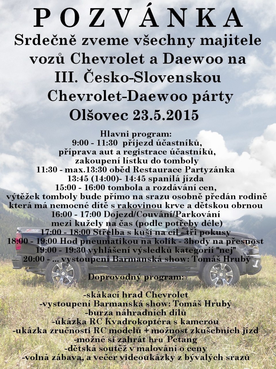 Je vidět,že si nezažil dřívější srazy. Ale nebudu tady nic psát,protože bych to zase odnesl,že pomlouvám a já nevím co. Ale na posledním Daewoo & Chevrolet srazu v Jedovnici(nemyslím aveopárty) bylo přes 100 aut! Dokonce tam byli i prodejci z Prahy s novinkami od Chevroletu. Bohužel,tohle skončilo,ale pokud by jsi chtěl poznat pohodový srazík nesoucí se v bývalém duchu,můžeš se na nás přijet podívat do Frenštátu. Každý je tam vítaný.KiaraStanley píše:Na druhou stranu, treba by nebylo od veci zjistit, jak to delaji jinde a jestli jsou uspesni, tak si z toho neco vzit do dalsich let.