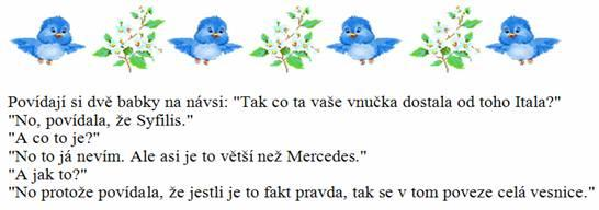 Čech :"No, já zajdu za paní Kudláčkovou, co bydlí pod náma, a řeknu jí "Co, ty stará děvko?" a ona hned "Co já, ale tvoje stará, to je děvka!" a řekne mi vše co potřebuju vědět..."
