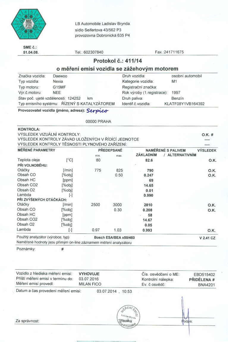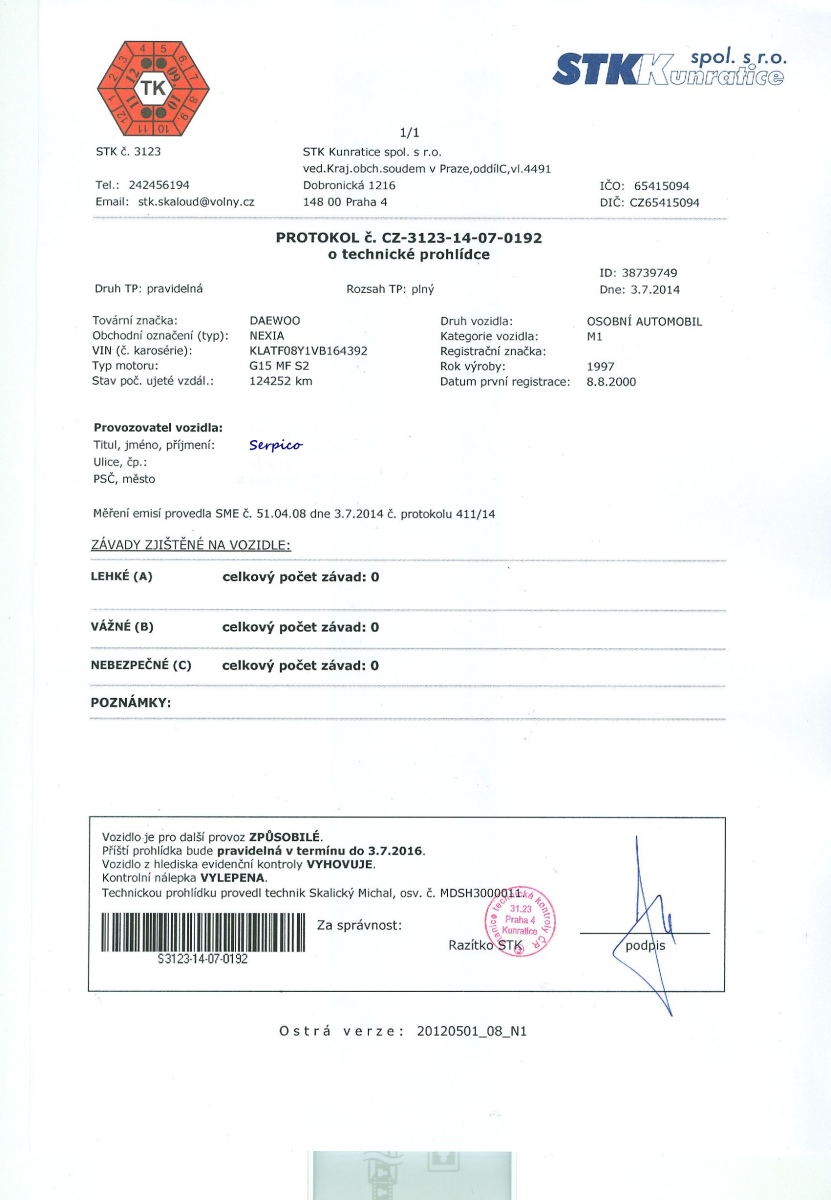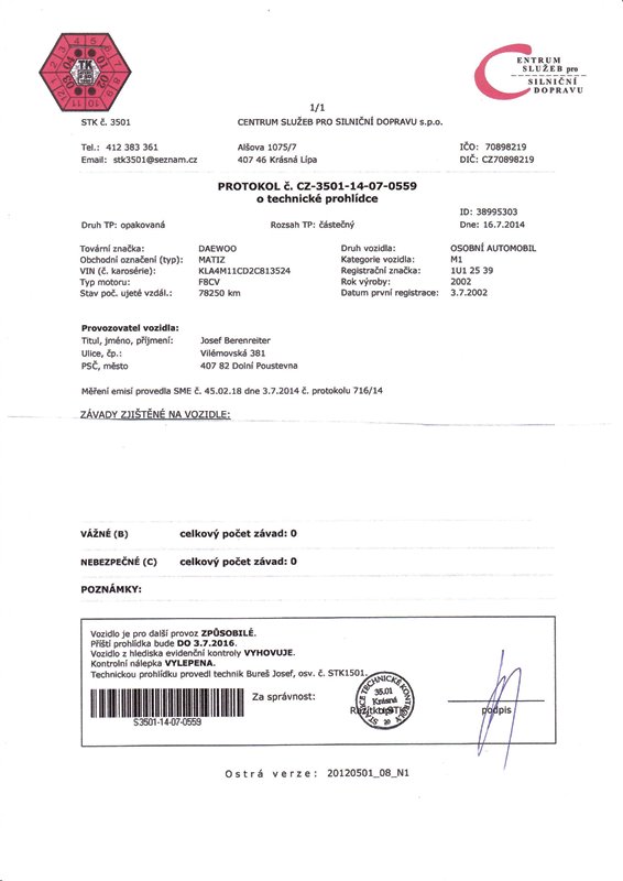 Zkontrolováno, vystaven nový protokol o způsobilosti bez vážných nebo snad nebezpečných závad, s platností do 3.7.2016 s vylepenou červenou známkou :o) :lol: na další 2 roky pohoda :PP: