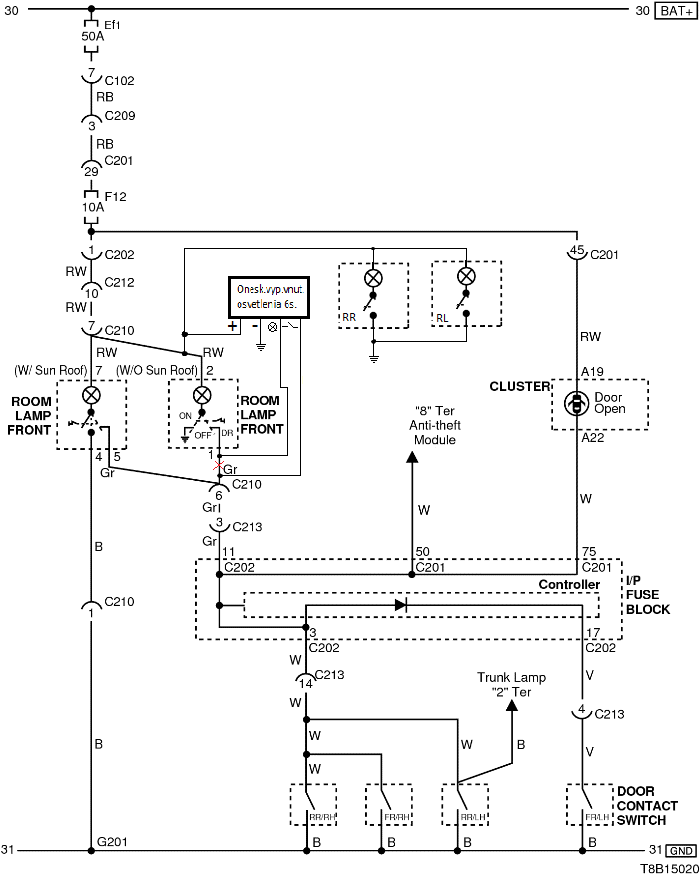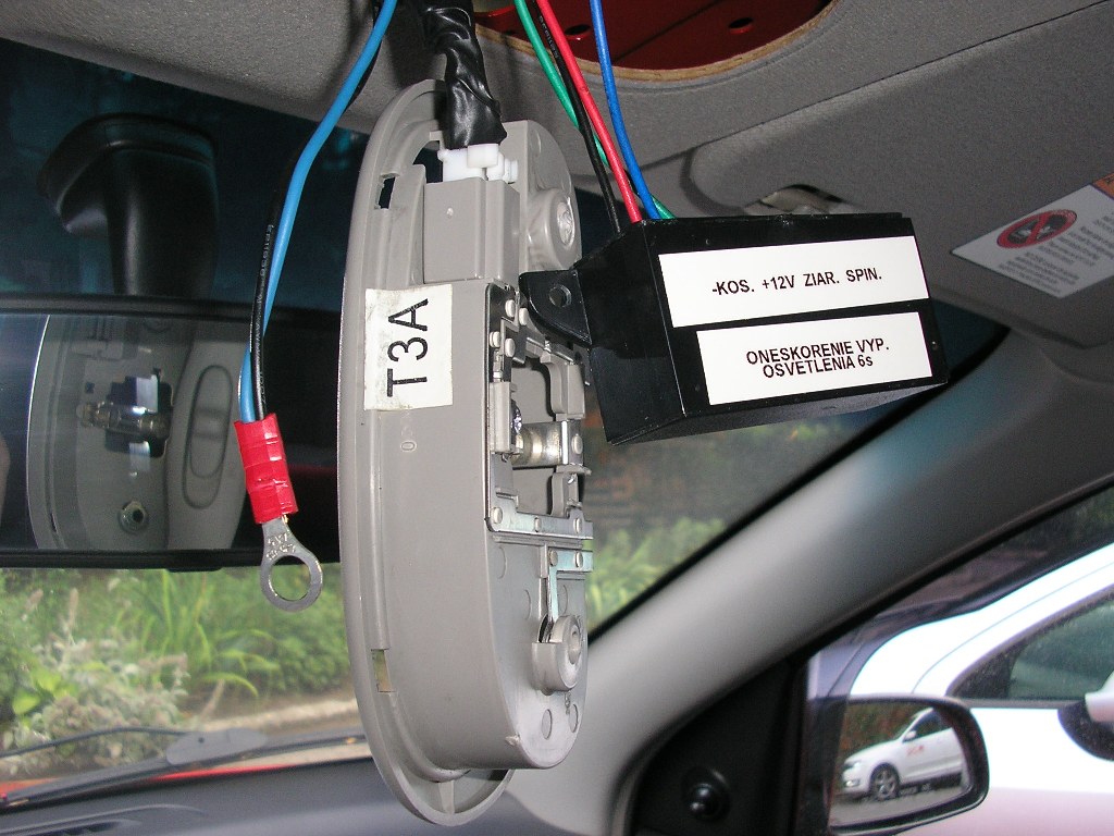 Zapojíš to tak že + na + pri lampe - na kostru voza druhí káblik ktorý ide na lampu sa prestrihne a ten koniec čo ide z lampy ide do oneskorovača na znak žiarovky a druhý káblik ten čo ide do útrob strechy voza ide zapojiť do oneskorovača na znak spínača.Jedna otázka na teba ,koľko sekúnd chceš aby to oneskorovalo vypnutie svetla?Podľa toho treba zmeniť hodnotu odporu R3 na oneskorovači.