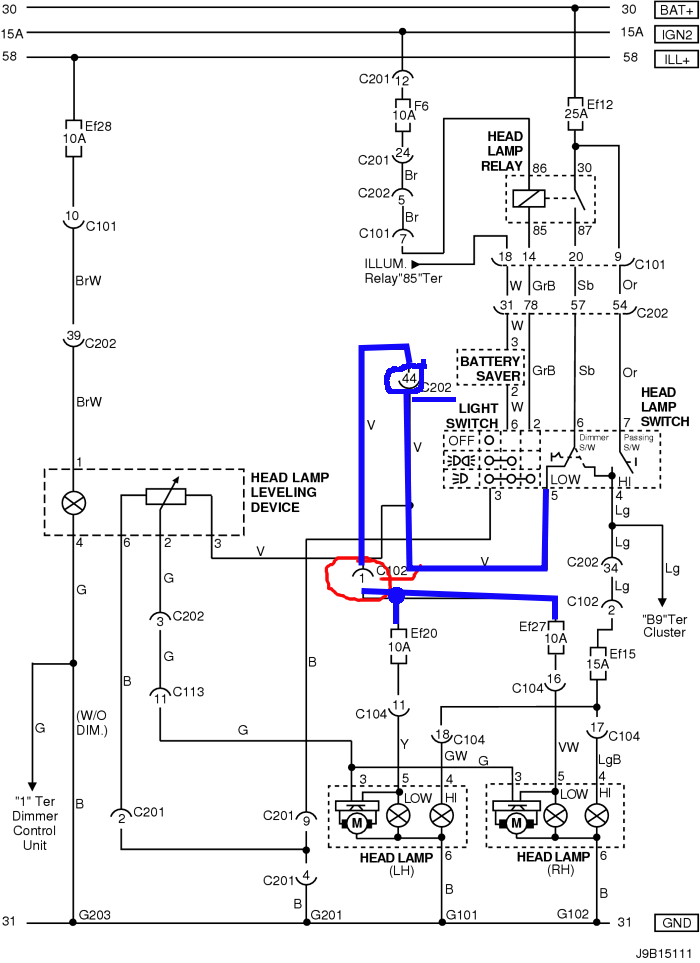 No pokud jseš si jistej, že to není rele, přepínač, ani pojistka, tak by to mohl být tenhle kontakt v konektoru C102. Pak už jdou dál dráty ke každýmu světlu sólo. To už by byla velká náhoda aby odešli obě světla naráz. (ale to schema je na Lacetti HB 2009, nevím jestli je stejný..)