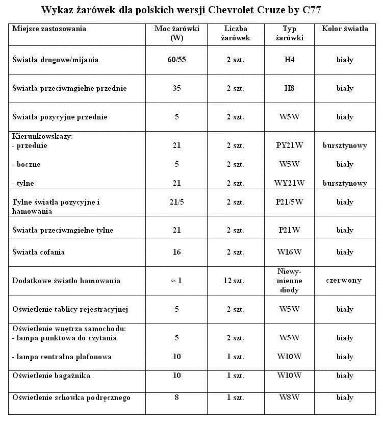 1) Tuší někdo, jaké všechny typy žárovek se na Cruze SW nacházejí (lampy, interier, atp.)? [typy, patice, wattáž, počty kusů a kde se nacházejí]