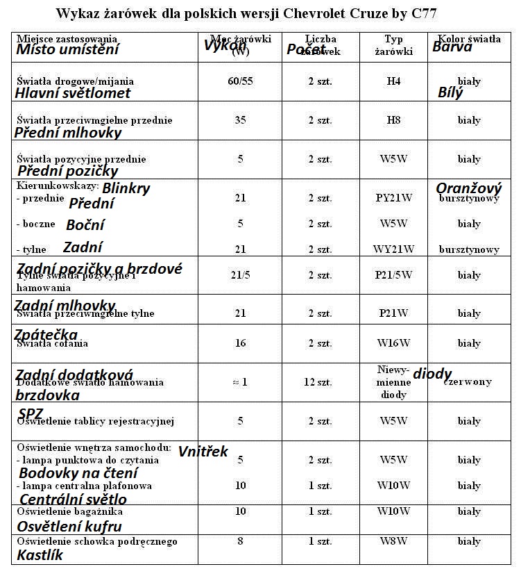Seznam všech žárovek pro Cruze SW, náhrady za lepší